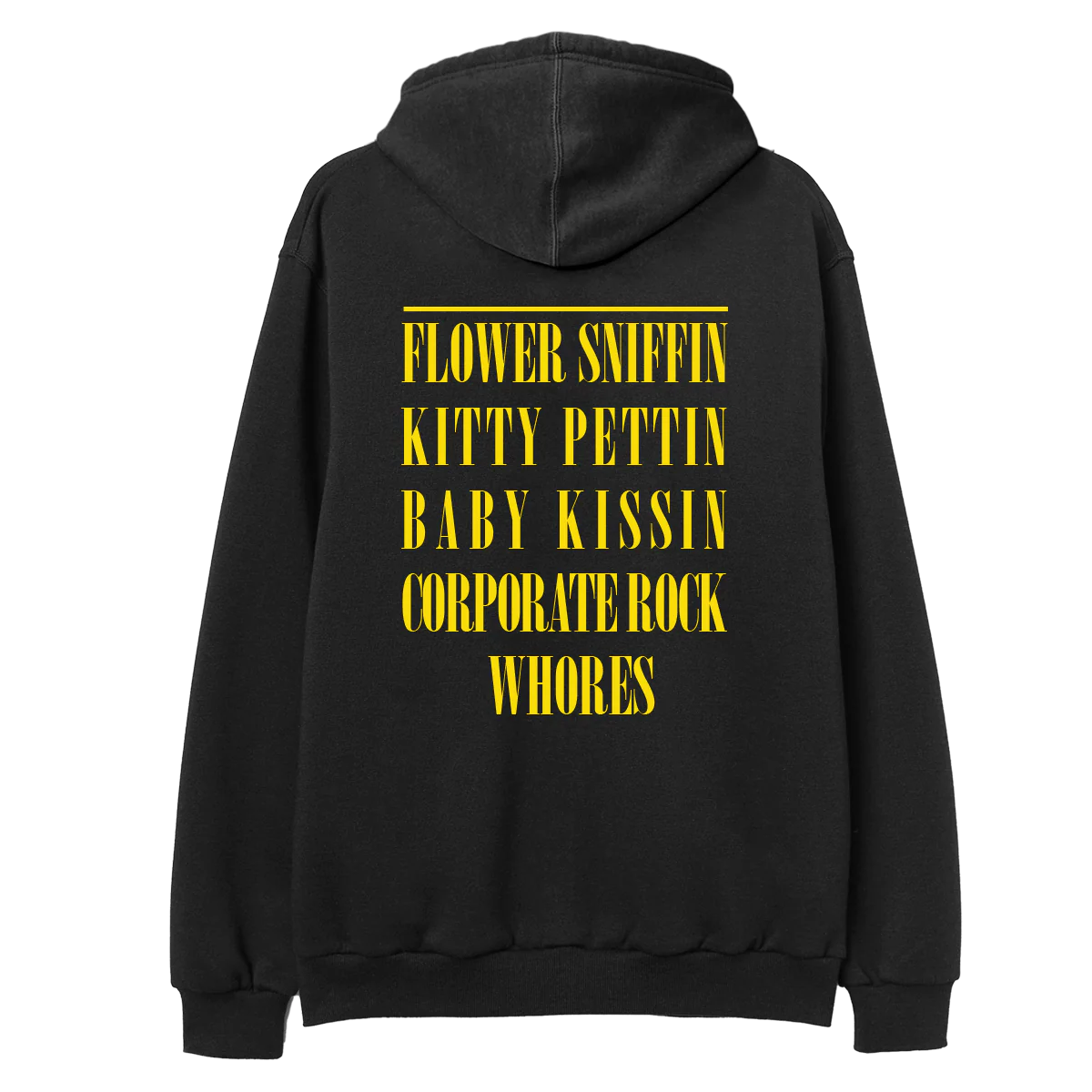 Smiley pullover hoodie. Black drawstring hood, kangaroo pocket.